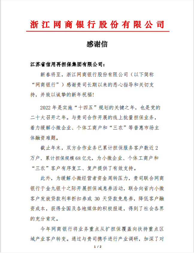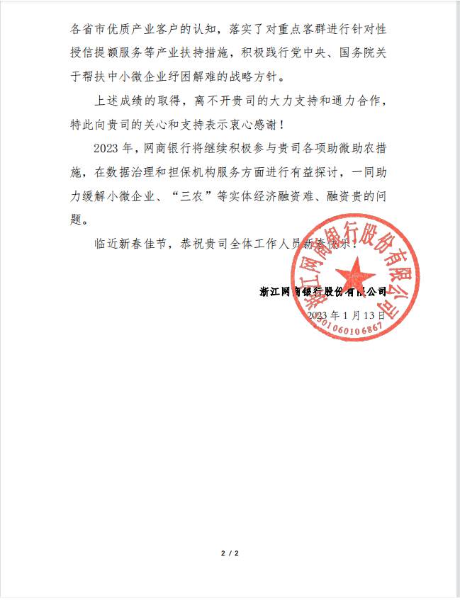 日前,浙江網(wǎng)商銀行向集團(tuán)發(fā)來感謝信,感謝集團(tuán)在支持地方經(jīng)濟(jì)發(fā)展,扶持小微企業(yè)中做出的突出貢獻(xiàn)。