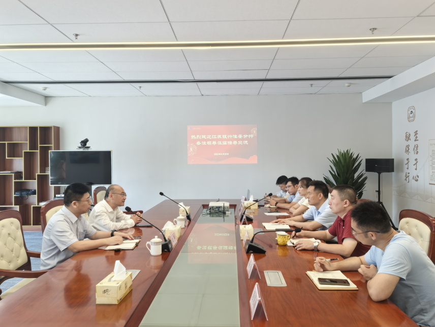 8月20日上午,江蘇銀行淮安分行副行長吳勁松、普惠金融部總經(jīng)理邊江到淮安分公司開展業(yè)務(wù)交流。雙方圍繞當(dāng)前合作成效、業(yè)務(wù)發(fā)展瓶頸及未來合作方向進行了深入交流,并達成多項共識。