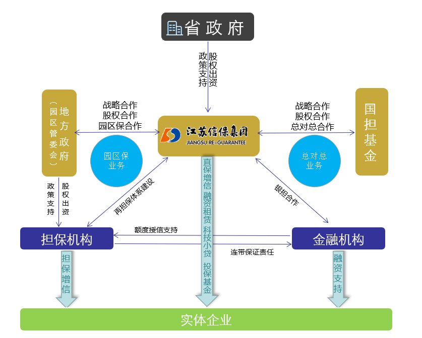 再擔保,是指探索創新再擔保業務合作模式,發揮再擔保增信、分險、規范、引領的政策性功能,利用江蘇信保集團的信用優勢和資本實力,推動全省體系擔保機構合規經營、穩健發展,更好地服務園區內的中小微企業和實體經濟發展。