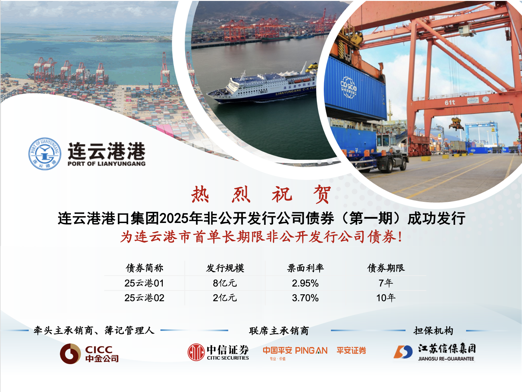 近日,由集團增信的連云港港口集團10億元非公開發(fā)行公司債券在上交所成功發(fā)行。本期債券采取雙期限互撥機制,其中7年期品種發(fā)行8億元,票面利率2.95%,10年期品種發(fā)行2億元,票面利率3.70%。本期債券的成功發(fā)行,是連云港市屬國企首次成功發(fā)行超長期限非公開發(fā)行公司債券,創(chuàng)下連云港市屬國企有史以來超長期限債券發(fā)行價格新低。