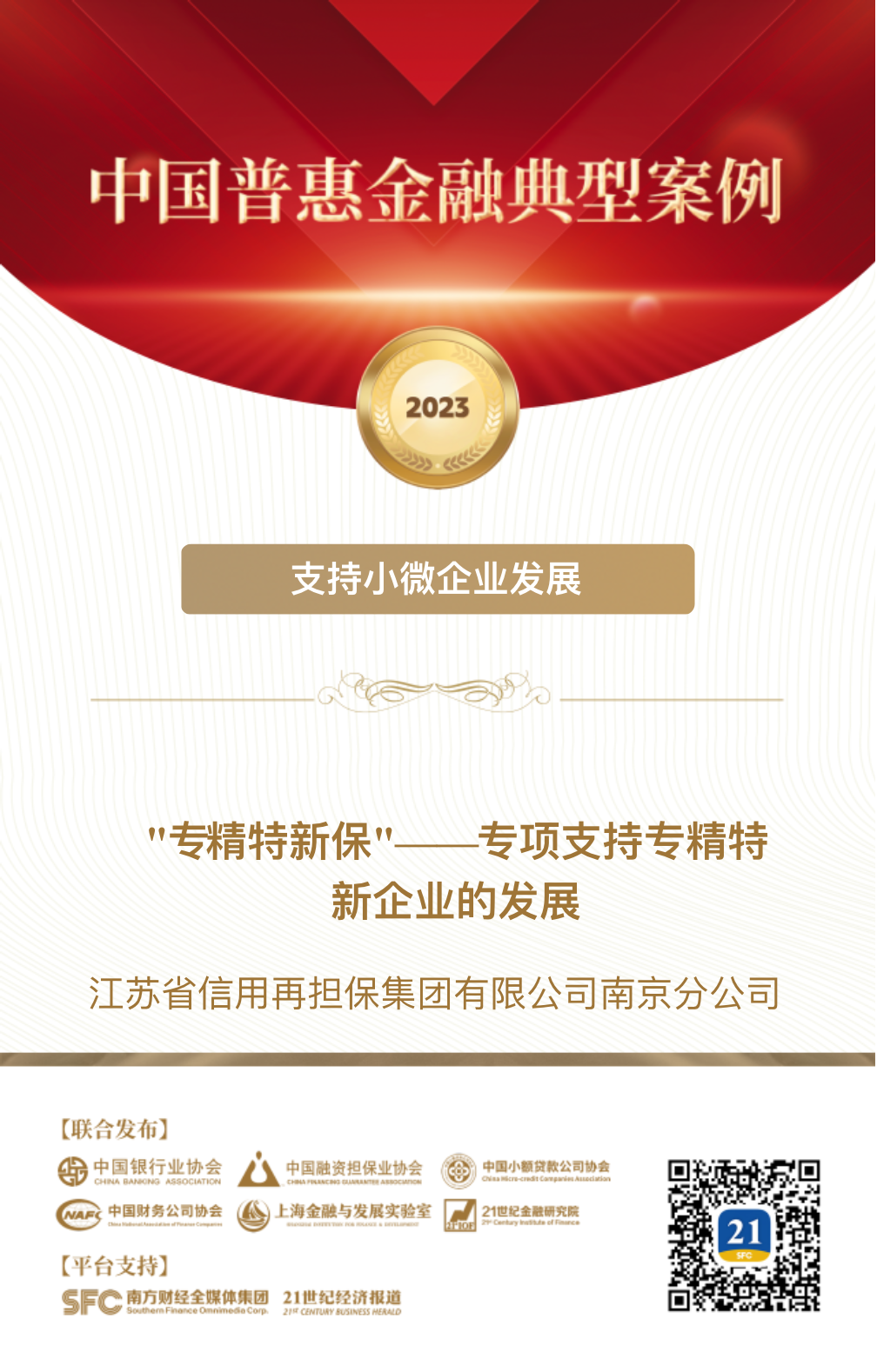今年4月,南方財經(jīng)全媒體集團聯(lián)合中國銀行業(yè)協(xié)會、中國融資擔保業(yè)協(xié)會、中國小額貸款公司協(xié)會、中國財務(wù)公司協(xié)會、上海金融與發(fā)展實驗室等單位開展“中國普惠金融典型案例 (2023) 征集”活動,得到全國530家單位積極響應(yīng)。經(jīng)過案例初審、網(wǎng)絡(luò)投票、協(xié)會推薦、專家終審等程序,南京分公司上報的《“專精特新保”——專項支持專精特新企業(yè)的發(fā)展》案例從761個案例中脫穎而出,成功入圍。