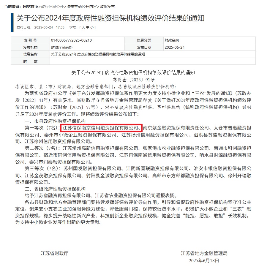 近日,江蘇省財(cái)政廳、省地方金融管理局聯(lián)合印發(fā)《關(guān)于公布2024年度政府性融資擔(dān)保機(jī)構(gòu)績(jī)效評(píng)價(jià)結(jié)果的通知》(蘇財(cái)金〔2025〕91號(hào)),全省共有23家市縣、省級(jí)政府性融資擔(dān)保機(jī)構(gòu)上榜,南京擔(dān)保再次榮登市縣政府性融資擔(dān)保機(jī)構(gòu)第一等次。