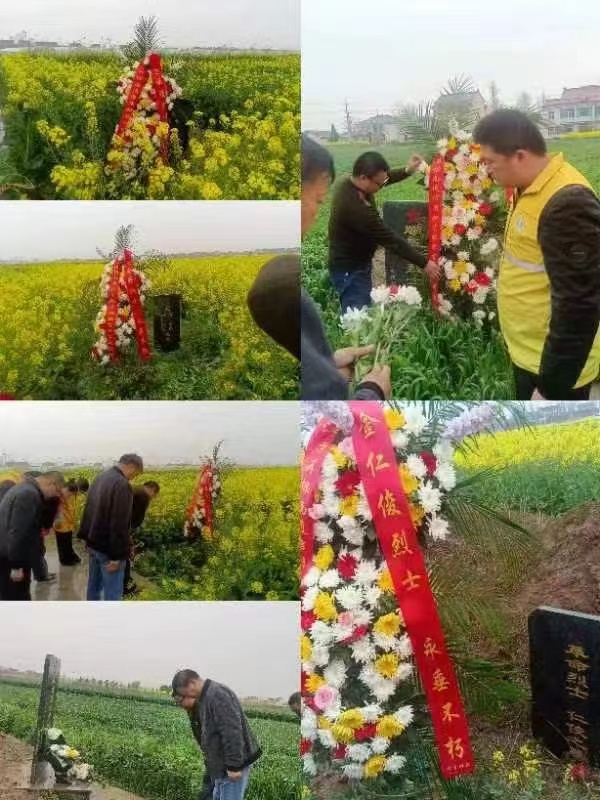 本次祭掃的四名烈士金仁俊、顧玉剛、包余青、包云青,均為黃建村人。他們?yōu)樾叛鰥^斗,在為人民幸福中犧牲,他們的生命雖已逝去,但他們可貴、崇高的精神,永遠留存在大家心中。為了表達對烈士的緬懷之情,南通地區(qū)黨支部于2023年對通往四名烈士墓碑約7.6公里主干道進行修繕。時隔一年,南通地區(qū)黨支部全體黨員再次懷著崇敬之情,通過默哀、敬獻花圈的方式向四名烈士表達哀思。