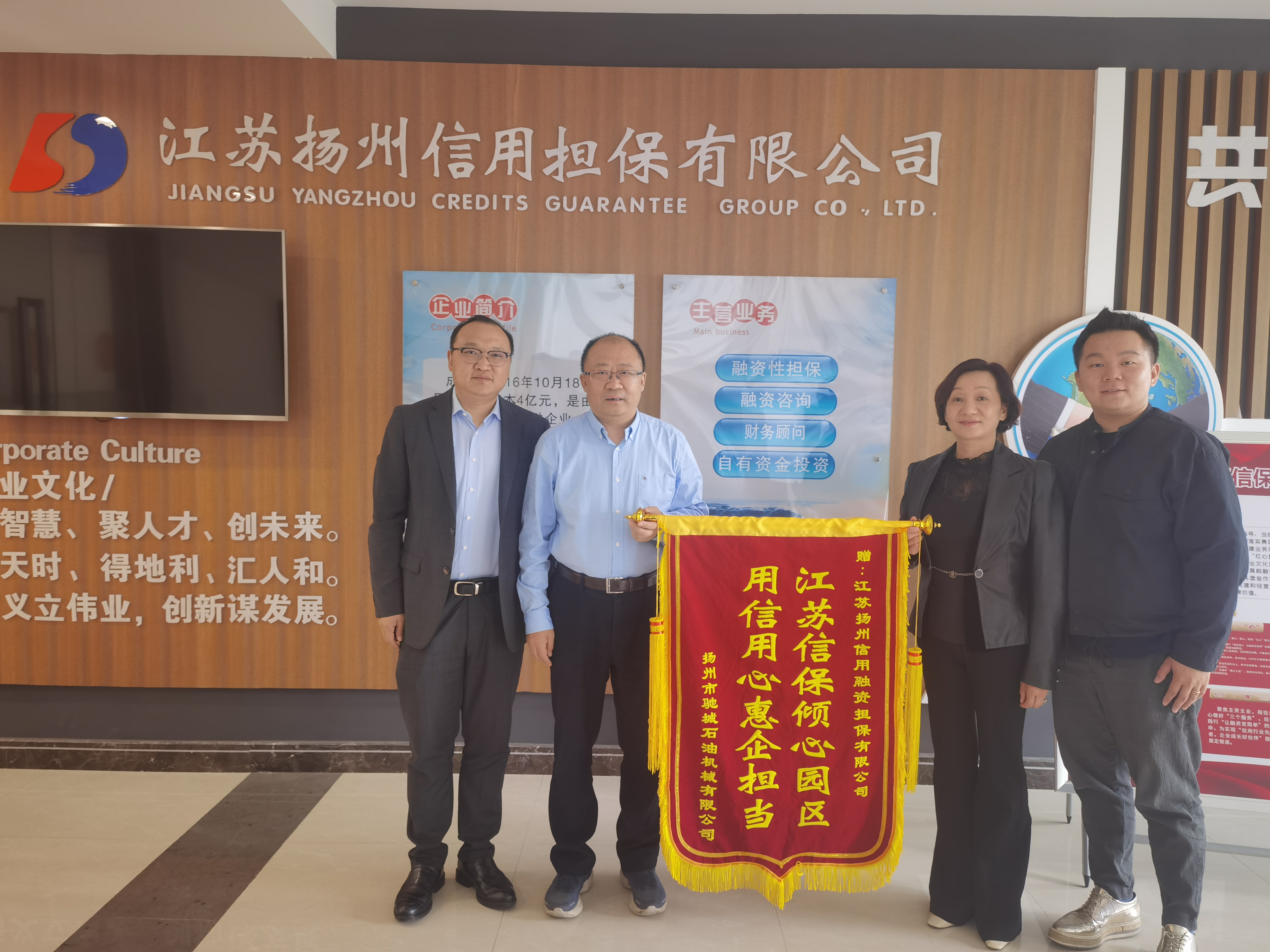 5月12日,揚州市馳城石油機械有限公司負責人一行赴揚州一體化區域,送上“江蘇信保傾心園區用信用心惠企擔當”錦旗,對揚州擔保在疫情期間給予企業的惠企降費政策和綜合金融服務表示衷心感謝。