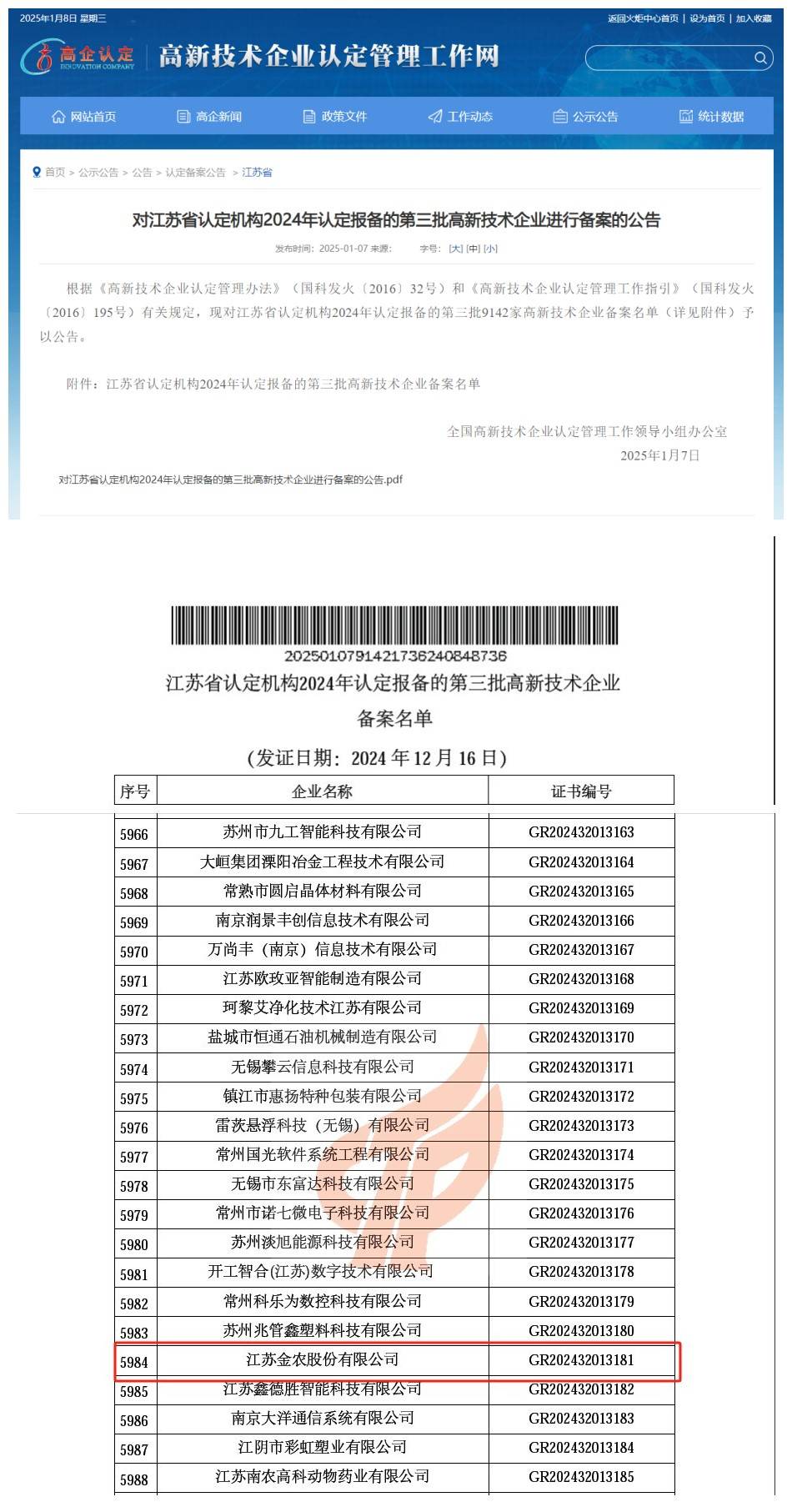 1月7日,全國高新技術企業認定管理工作領導小組辦公室發布《對江蘇省認定機構2024年認定報備的第三批高新技術企業進行備案的公告》,江蘇金農股份有限公司(以下簡稱“金農公司”)成功通過評審,被認定為國家高新技術企業。